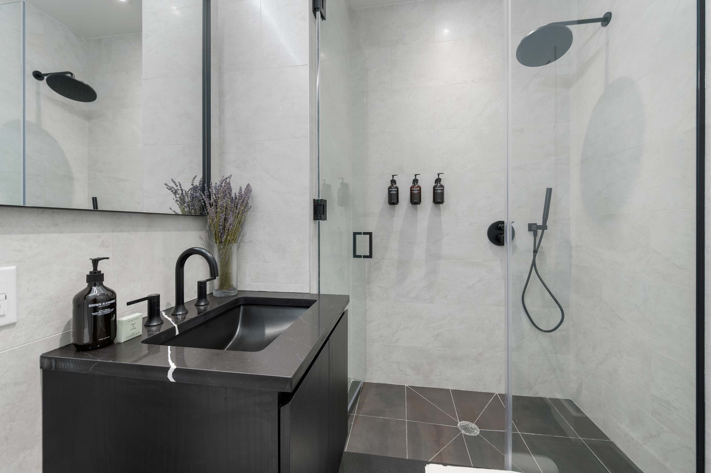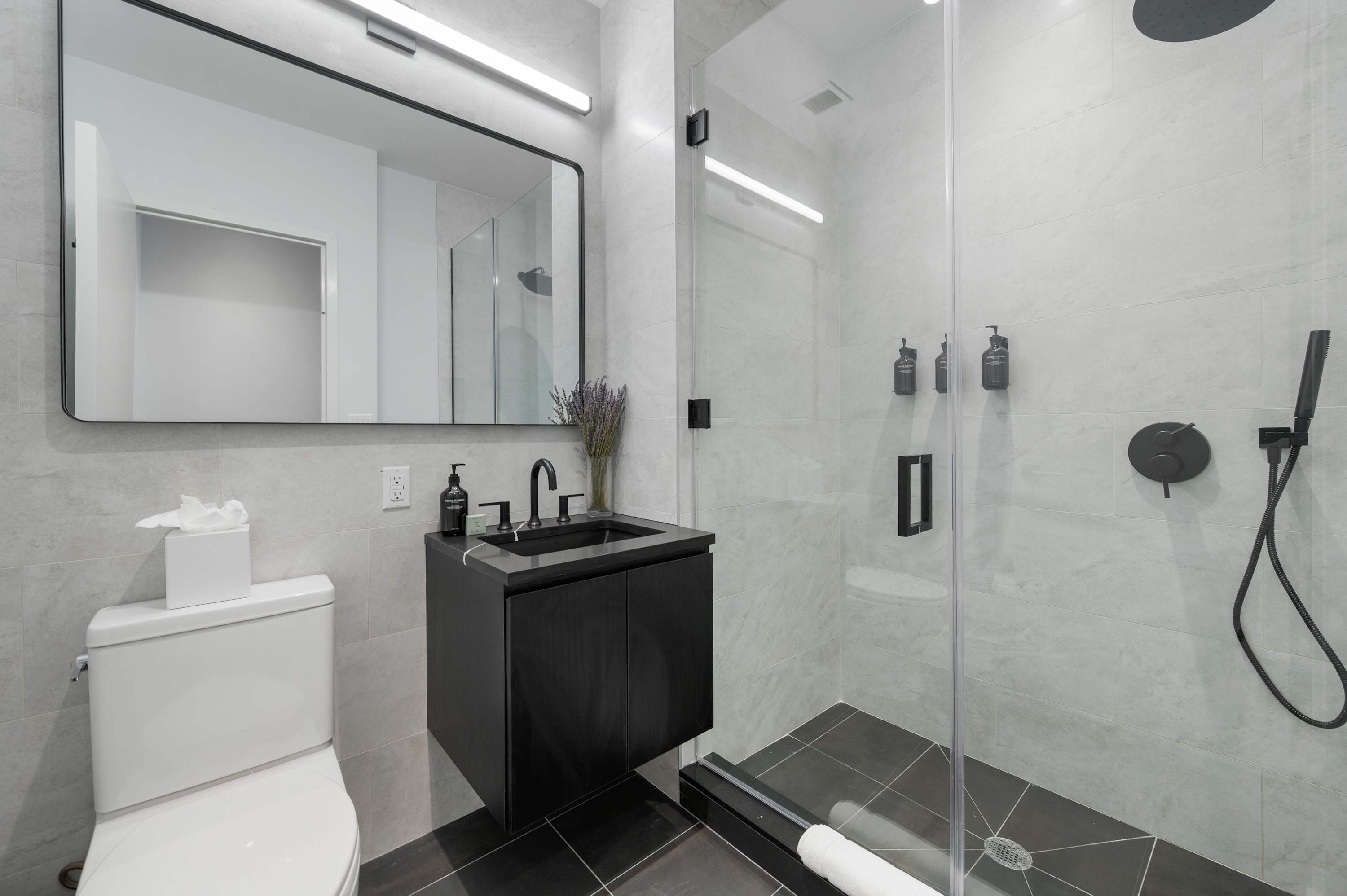 The space features a modern renovated full bathroom with complimentary essentials (shampoo, shower gel, hand soap, and toilet paper) and a hair dryer.