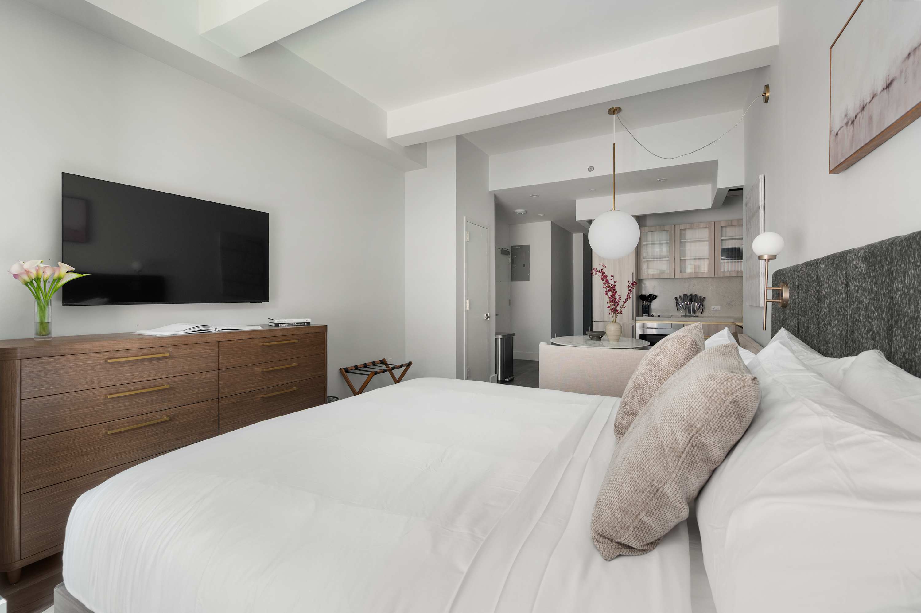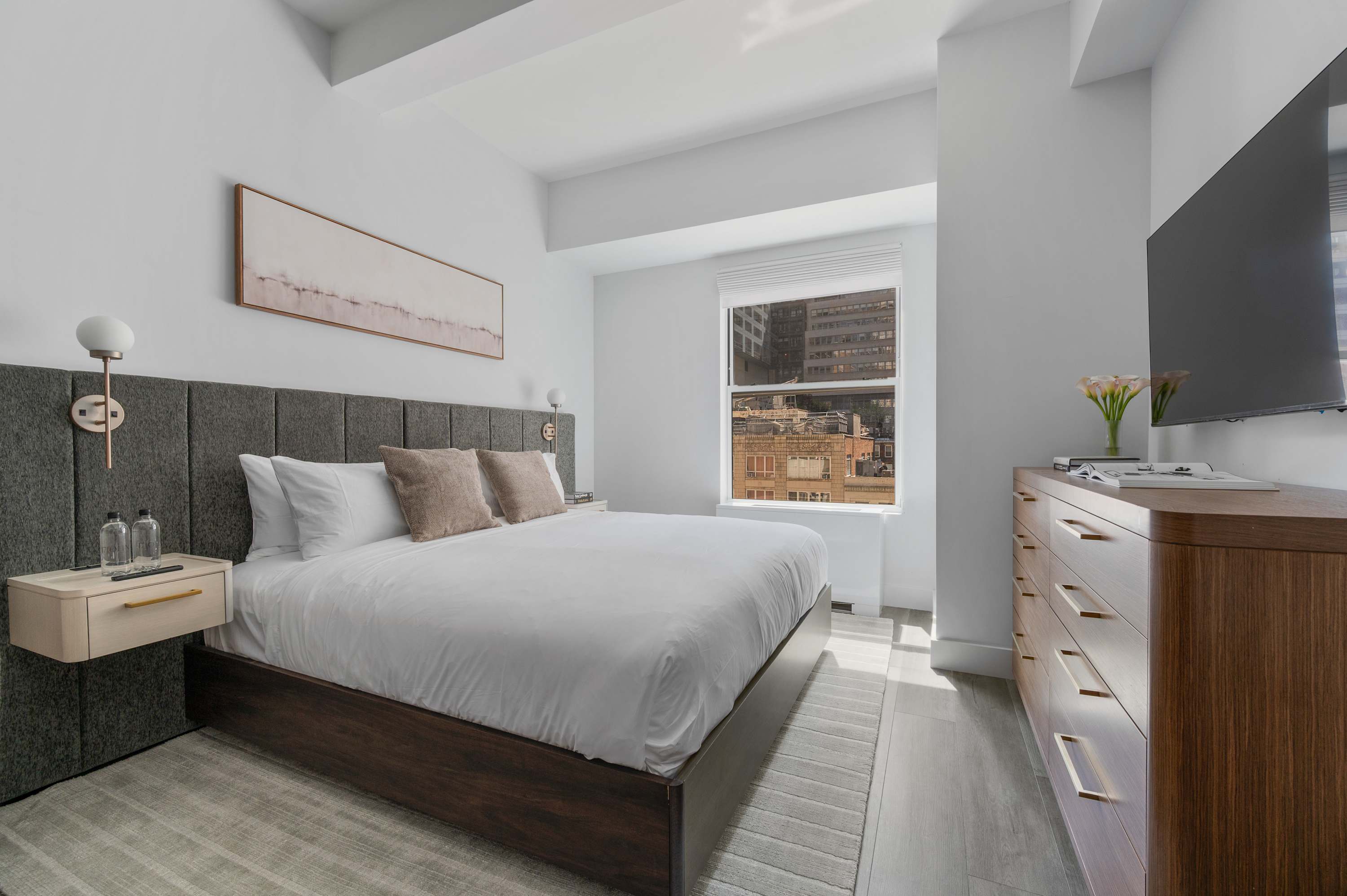Stay at our BRAND NEW Elite King Studio at 17John! Welcome to your home away from home in the heart of the Financial District with a fully equipped 460 sf apartment! Our modern accommodations offer the perfect blend of comfort, convenience, and city living. You’ll find everything you need just steps away. There’s a CVS conveniently located on-site for all your essentials, and multiple grocery stores are within a 2-minute walk, making it easy to stock up for your stay. Whether you’re preparing meals in your fully equipped kitchen or grabbing a quick snack, you’re always covered. Enjoy a stunning Manhattan view from our rooftop, or relax in the lounge on the seventh floor. The 9/11 Memorial & Museum is a must-see breathtaking tribute, only a five-minute walk away. Grab dinner at South Street Seaport or admire the historic ships. Find iconic monuments and stunning mid-century architecture on every block. Beyond the essentials, the neighborhood is a treasure trove of iconic landmarks, world-class dining, and cultural attractions. With excellent subway access at Fulton Street Station, you’re perfectly positioned to explore all of New York City. Whether you're here for business or leisure, 17John is your gateway to the best of NYC.