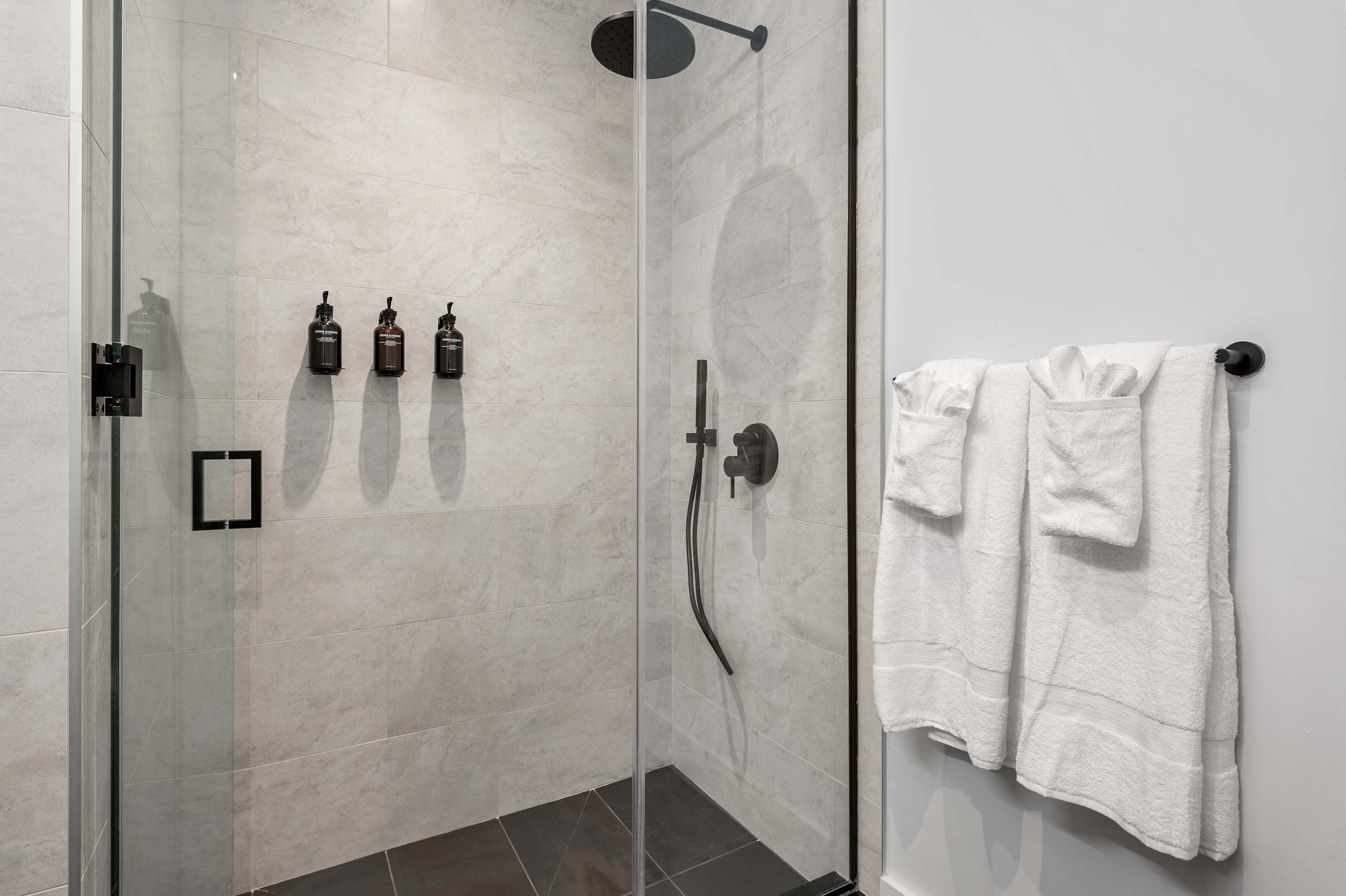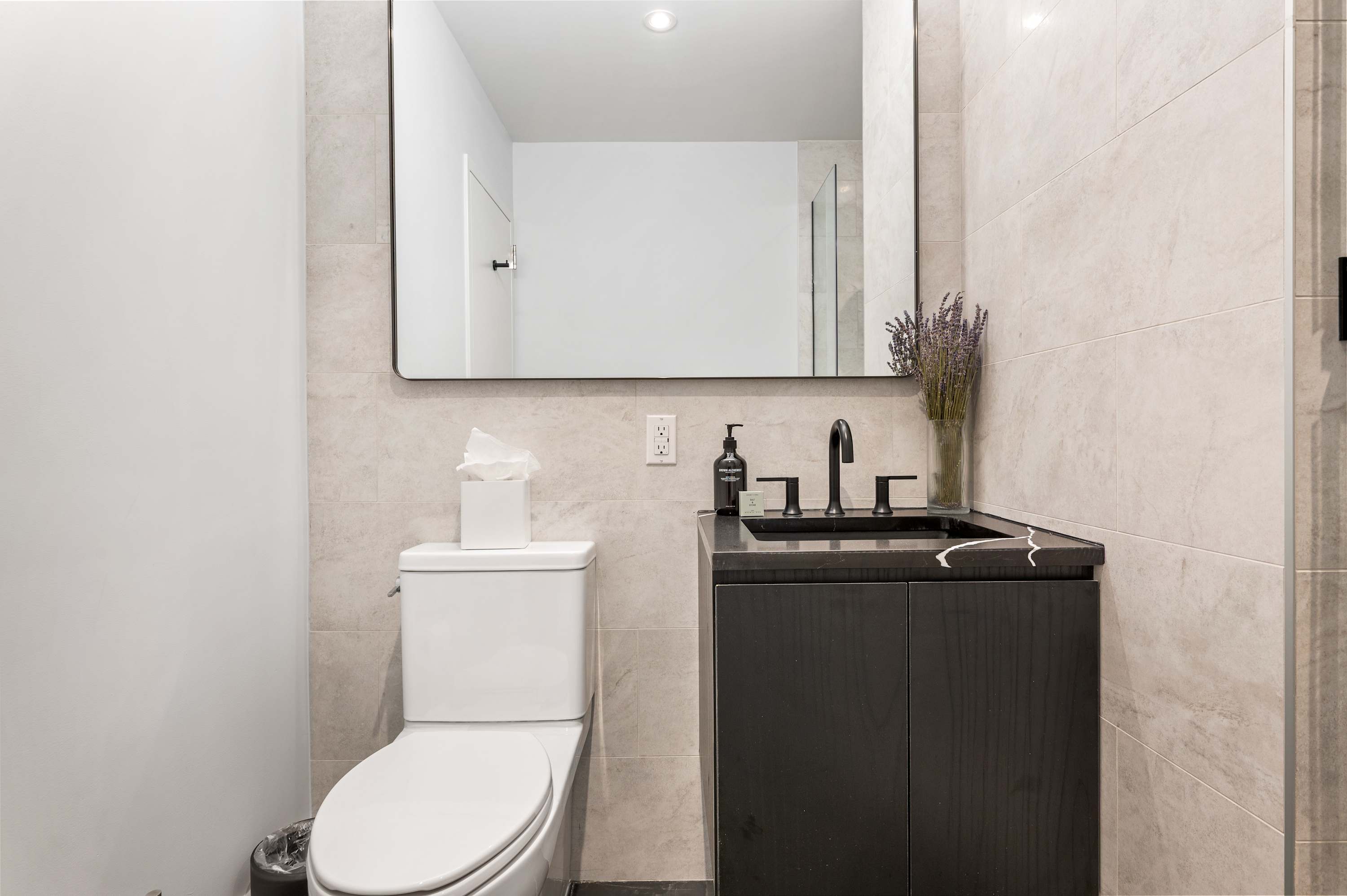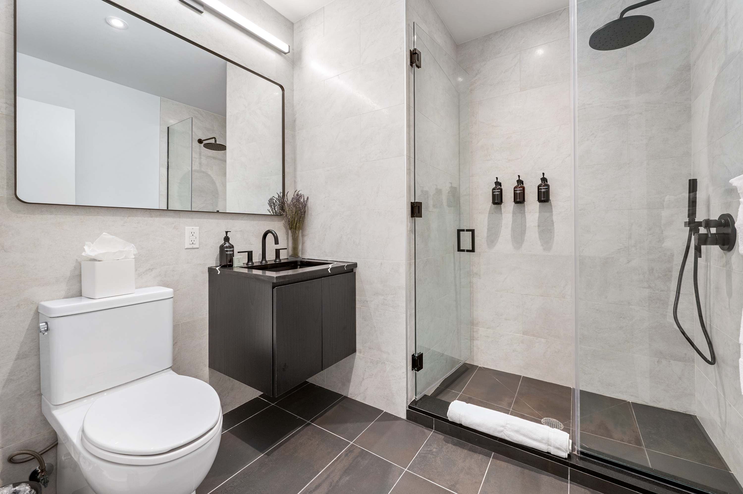 The space features a modern renovated full bathroom with complimentary essentials (shampoo, shower gel, hand soap, and toilet paper) and a hair dryer.