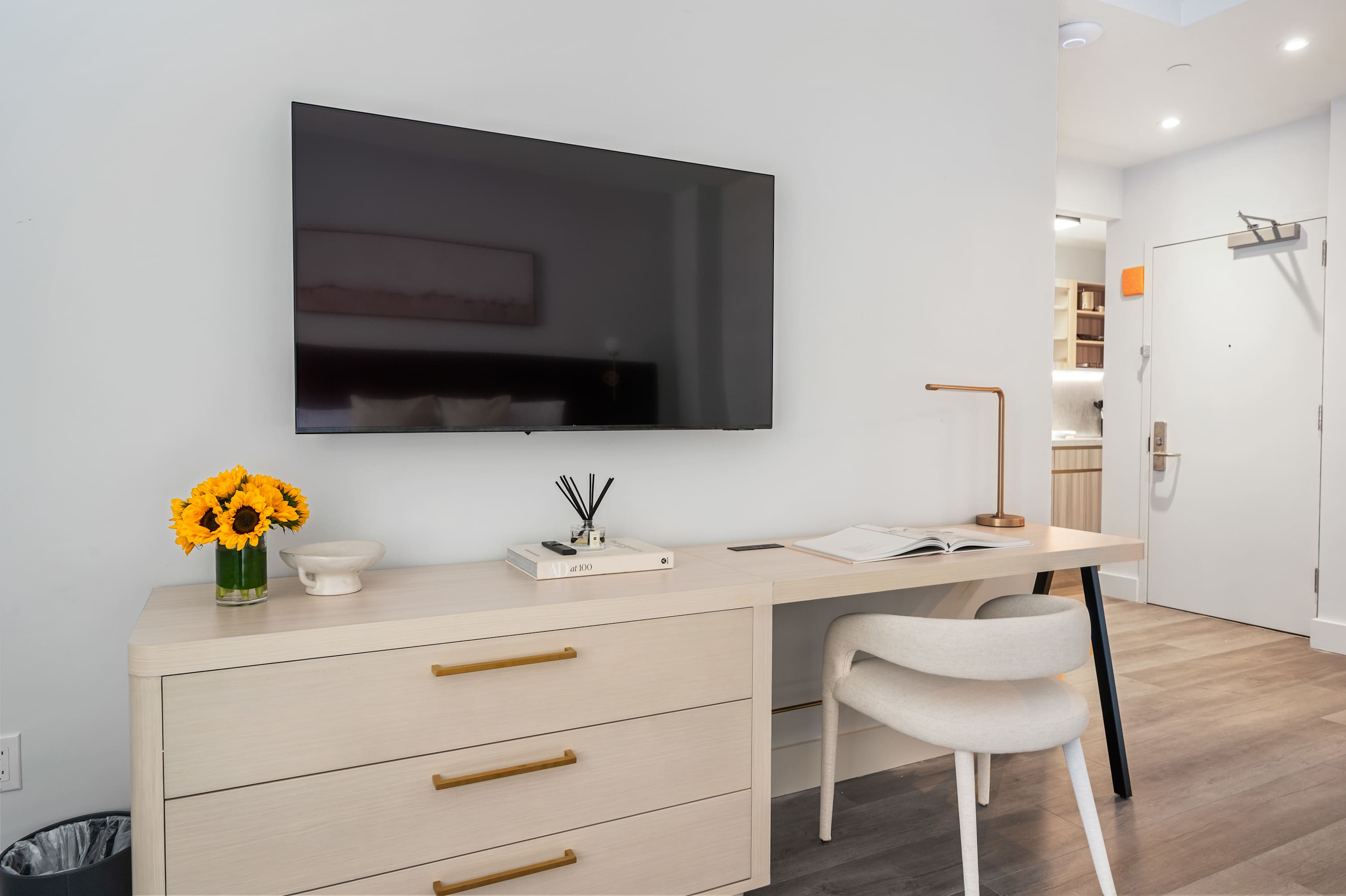 • Flat screen Smart TVs for streaming apps, high-speed WiFi, basic cable TV, and a dedicated workspace