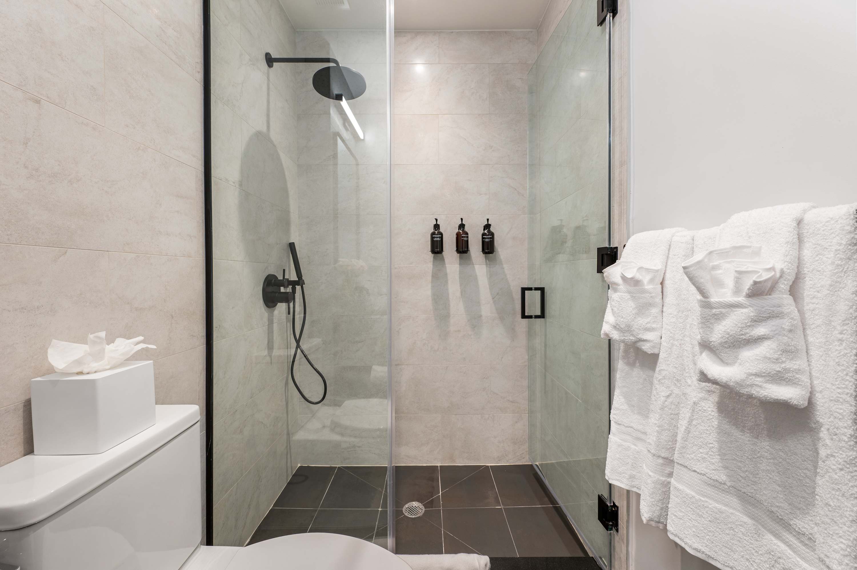 The space features a modern renovated full bathroom with complimentary essentials (shampoo, shower gel, hand soap, and toilet paper) and a hair dryer.
